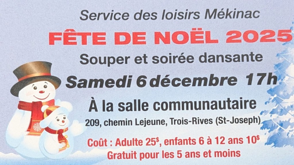 Nous vous transmettons la publicité pour les activités du temps des fêtes, organisées par le Service des loisirs Mékinac.