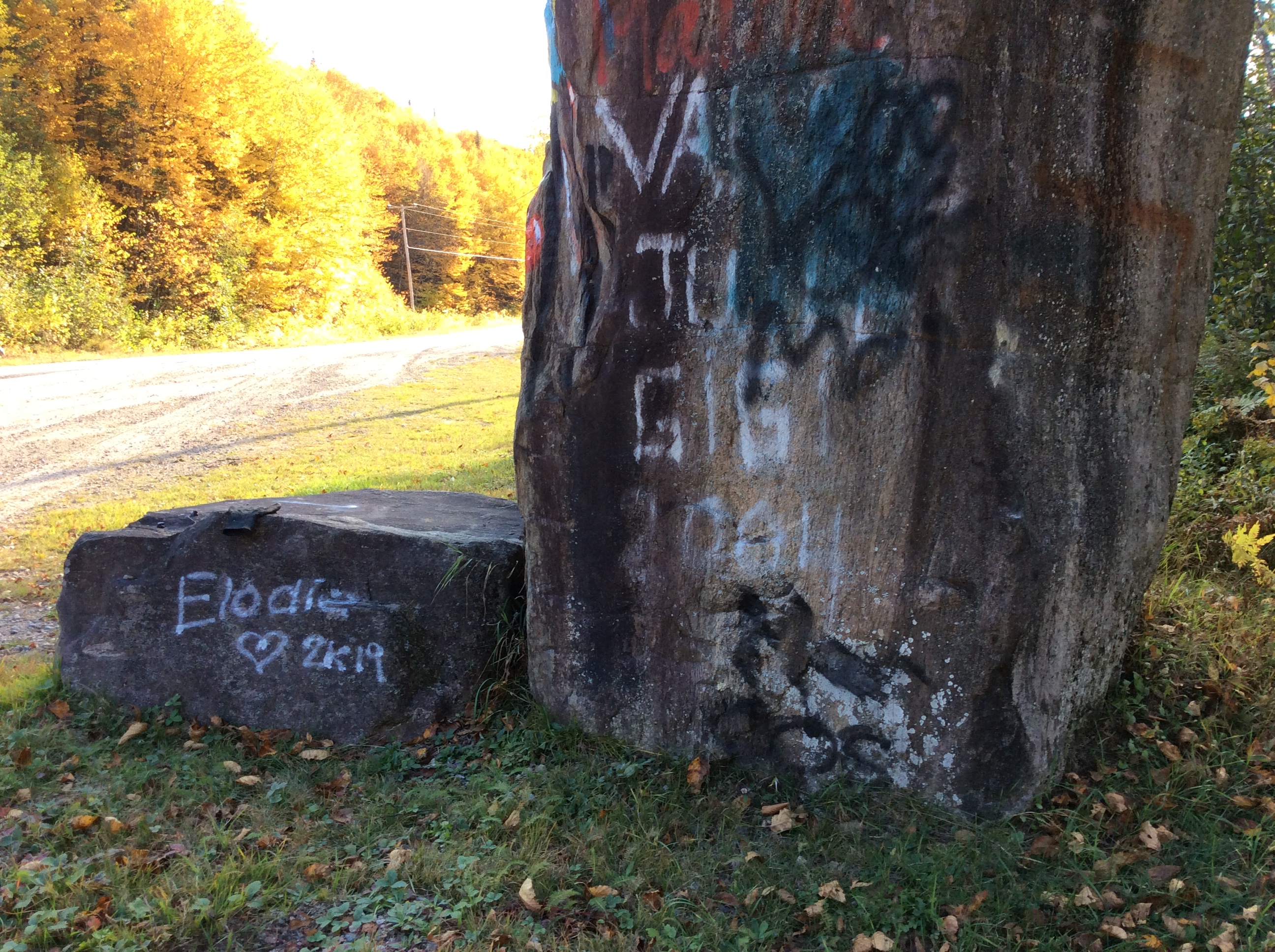 Plusieurs d’entrevous avez remarqué l’apparition de graffitis sur les roches placées près de la prise d’eau de la rivière – juste avant le pont du Lac Mékinac. Nous avons soulevé cette problématique à la municipalité, et le conseil municipal a conclu ‘qu’aucune action ne serait posée par la Municipalité pour faire disparaître les graffitis sur les roches du chemin du Lac-Mékinac, étant donné leur caractère inoffensif’.