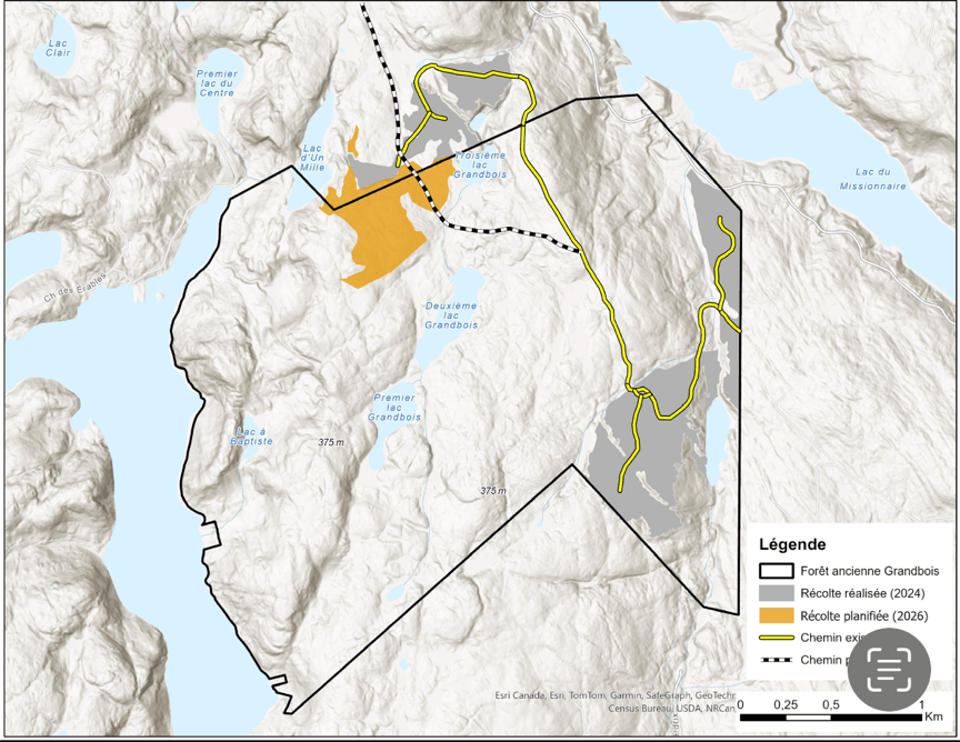 En tant qu’Association du lac Mékinac, nous avons appuyé dès le début le projet d’aire protégé de la Forêt des lacs Grandbois. Le projet a aussi été appuyé par la MRC de Mékinac. Le processus d’analyse par le gouvernement est donc en cours et des tables de concertations sont prévues en février 2026. Mais, pendant ce processus, ce territoire n’est pas mis en protection. Et comme vous savez, ou on va vous l’aprendre, Scierie Dion désire y effectuer un nouveau chemin et une coupe à l’intérieur même de ce territoire qui attend d’être protégé. Le MRNF a accordé un permis à Scierie Dion malgré le fait que ce secteur fait partie des projets d’aires protégés, qui ont pour but de répondre aux objectifs du Ministère de l’Environnement de protéger 30% de son territoire d’ici 2030.