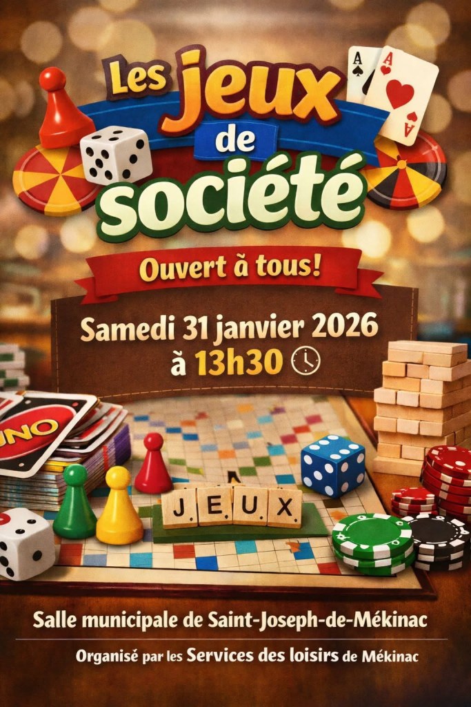Pour votre information, le service des loisirs de Mékinac organise une activité de jeux de société et invite tous les intéressés à y participer.