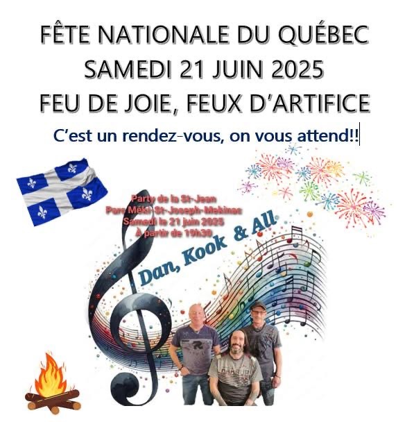 Invitation du Service des loisirs Mékinac pour la fête nationale du Québec qui aura lieu ce soir le 21 juin 2025, dès 19h30. En cas de pluie, remis à demain le 22 juin 2025, même heure